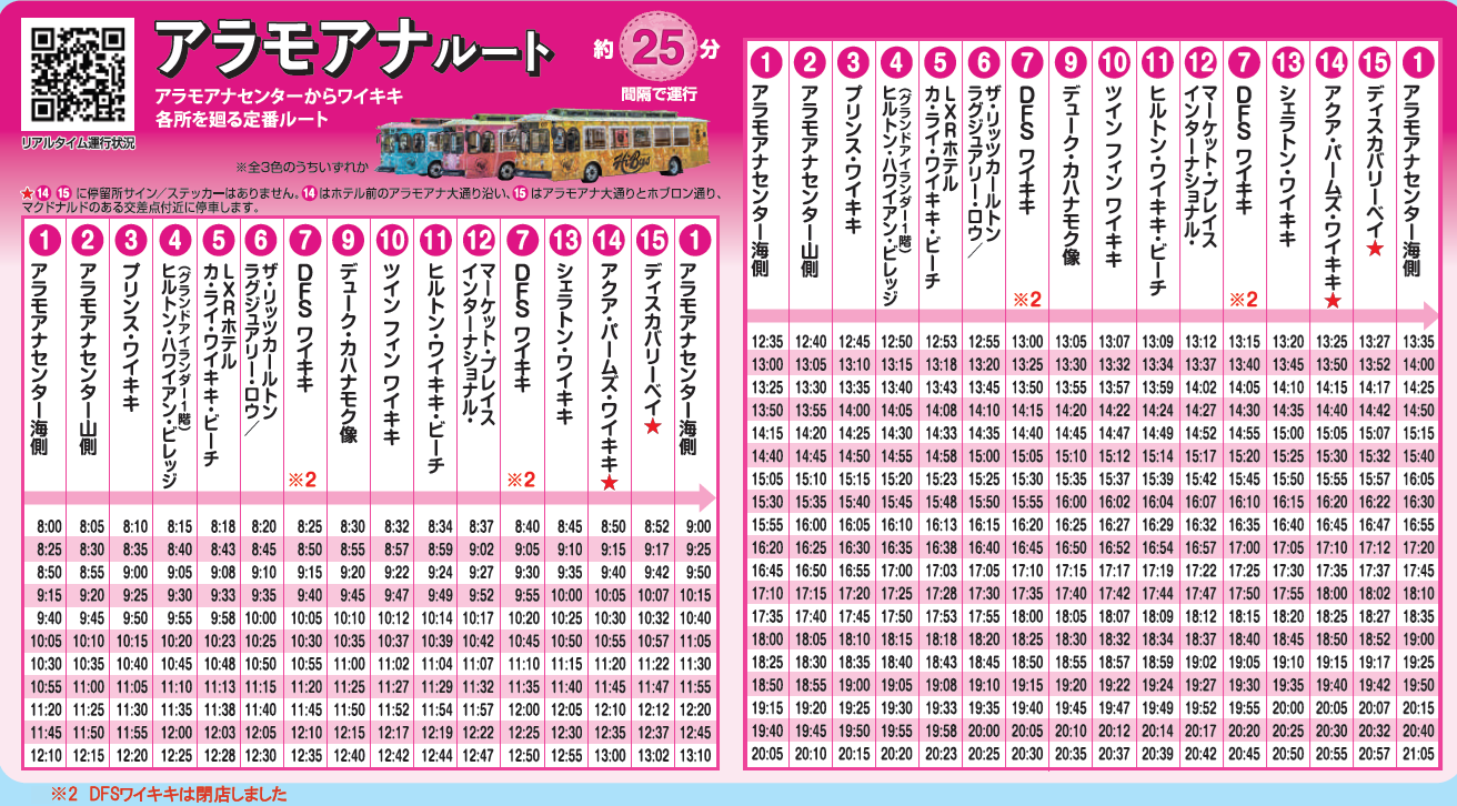 HiBus以外のトロリーや送迎車両も数多く利用するため、その都度空いているスポットに停車します。アラモアナルート、ダイヤモンドヘッドルートそしてカハラルートの発着場所です。