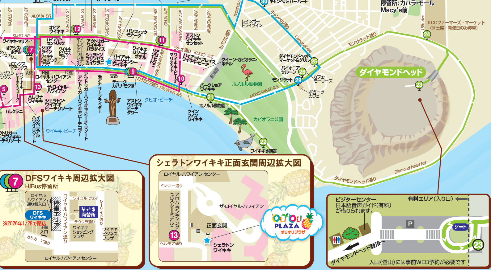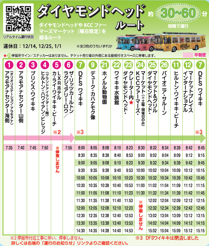 ダイヤモンドヘッドへ朝からお出かけいただける早朝便も運行!登山口に停車するので、観光にも便利です。また、ホノルル動物園や水族館、土曜日の午前中には人気のKCCファーマーズマーケットにも停車します。※ダイヤモンドヘッドハイキングは事前にオンライン予約が必要となります。