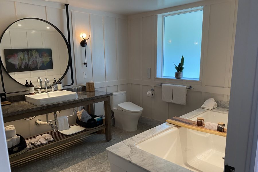 おそろいのスリッパでビーチをお散歩、歩き疲れたら深めのバスタブで肩まで浸かってリラックス。