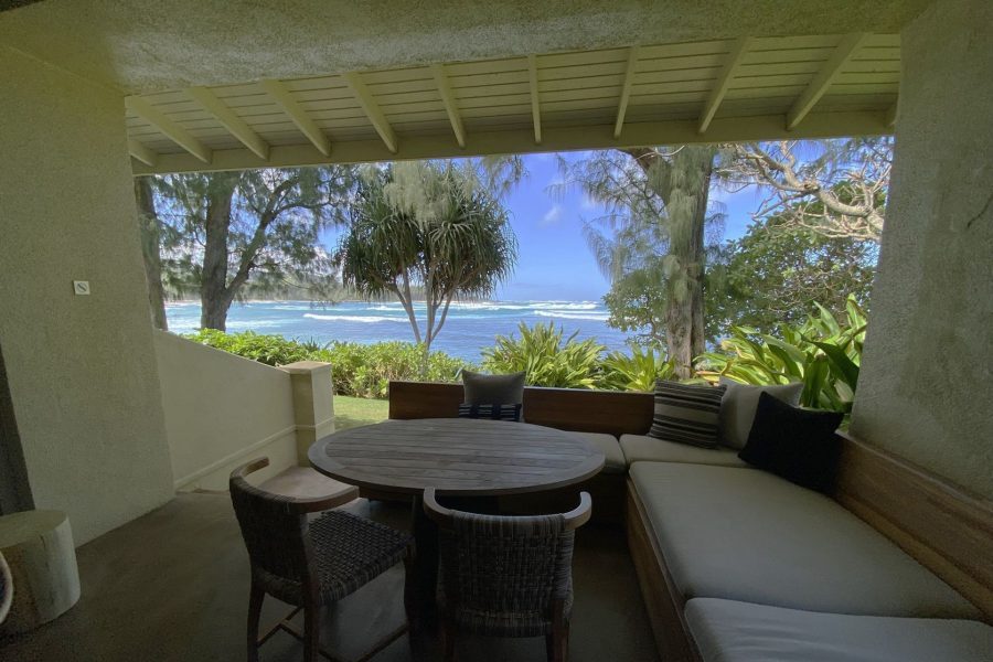 ベッドルームの向こうにはオープンエアーのラナイとその目の前には芝生のスベースとプライベートなビーチが広がっています。