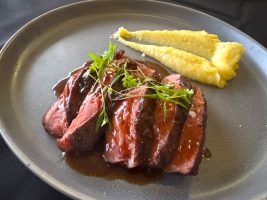 しっとりと焼き上げたフラットアイアンステーキ。日本語だと「ミスジ」と呼ばれる、牛の肩にあたる部位です。