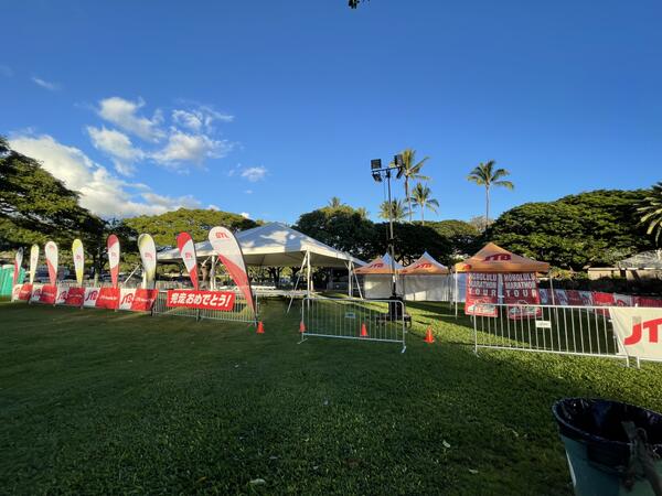 ホノルルの空港に到着されたら、JTBカウンターにて、大会当日に必要なJTBロゴ入りステッカーとポンチョをお渡しします。