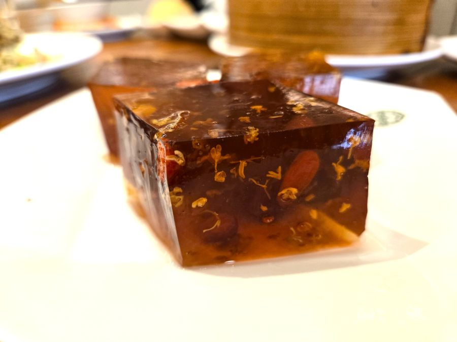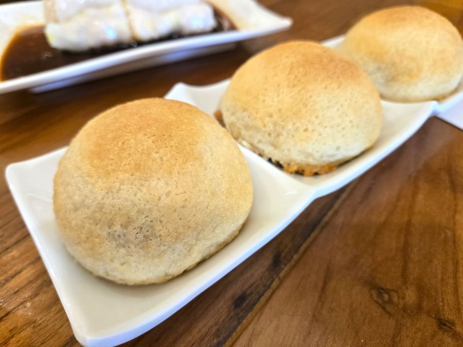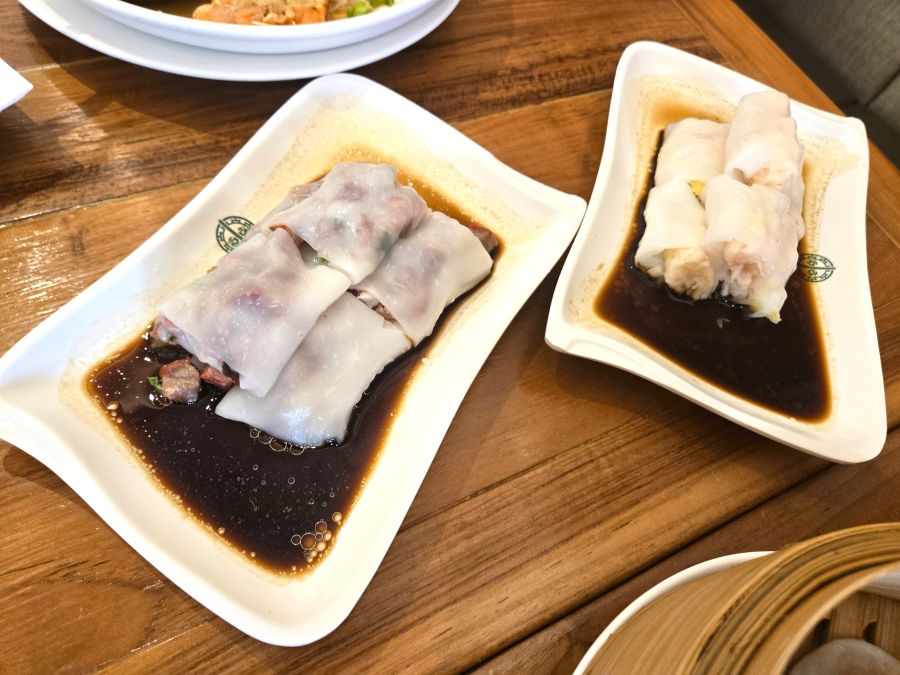 左はチャーシューのチョンファン $8.50、右は海老と黄ニラのチョンファン $8.95。水餃子のようなつるっとした食感が楽しい。