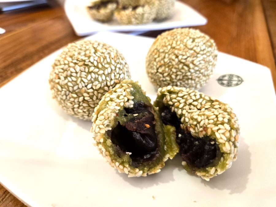 中華の締めといえば胡麻団子。抹茶のほのかな風味に嬉しくなります。