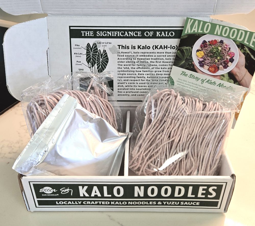 ハワイの伝統食材「カロ(タロイモ)」を使用した常温保存可能なヌードルに、爽やかな柚子醤油ソースを組み合わせた2食入り。Sig Zaneの美しいデザインが施されたパッケージがとても素敵で、ギフトにもぴったりです。