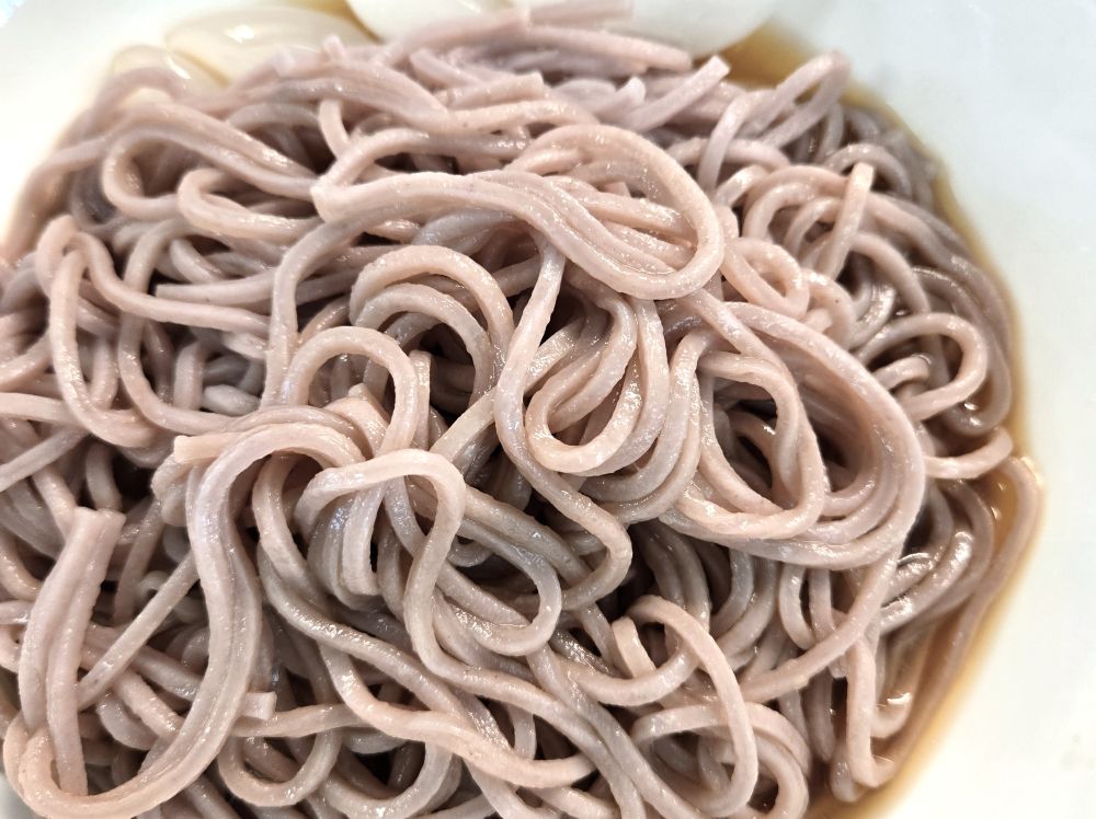 薄紫色のカロ(タロイモ)乾麺は通常より長く約9分ほど茹でて、流水で締めて冷やして食べるスタイルで、お皿に盛りつけてソースとあえます。茹で時間が長いのはカロからでる澱粉のせいか、非常にコシのある麺に仕上がります。