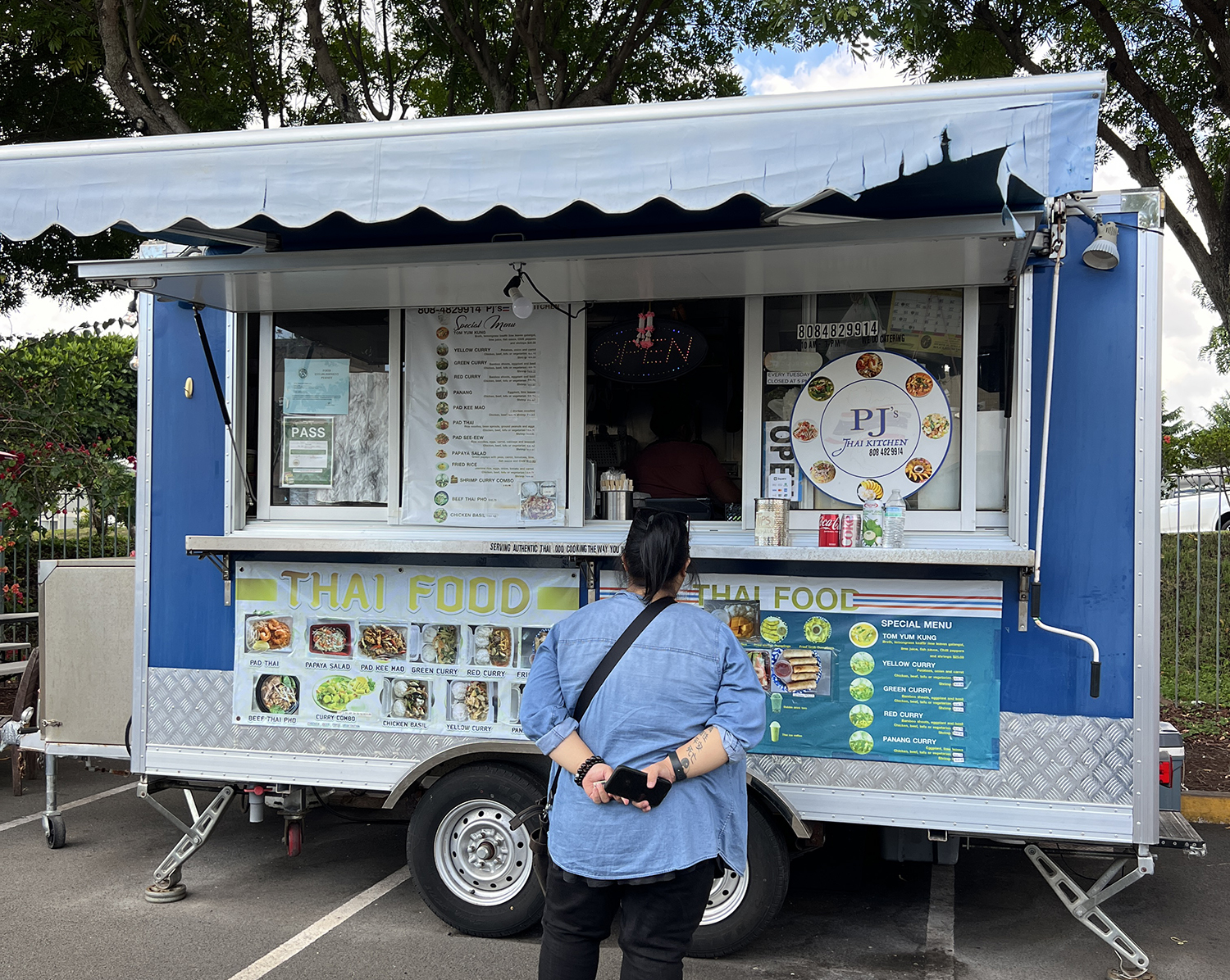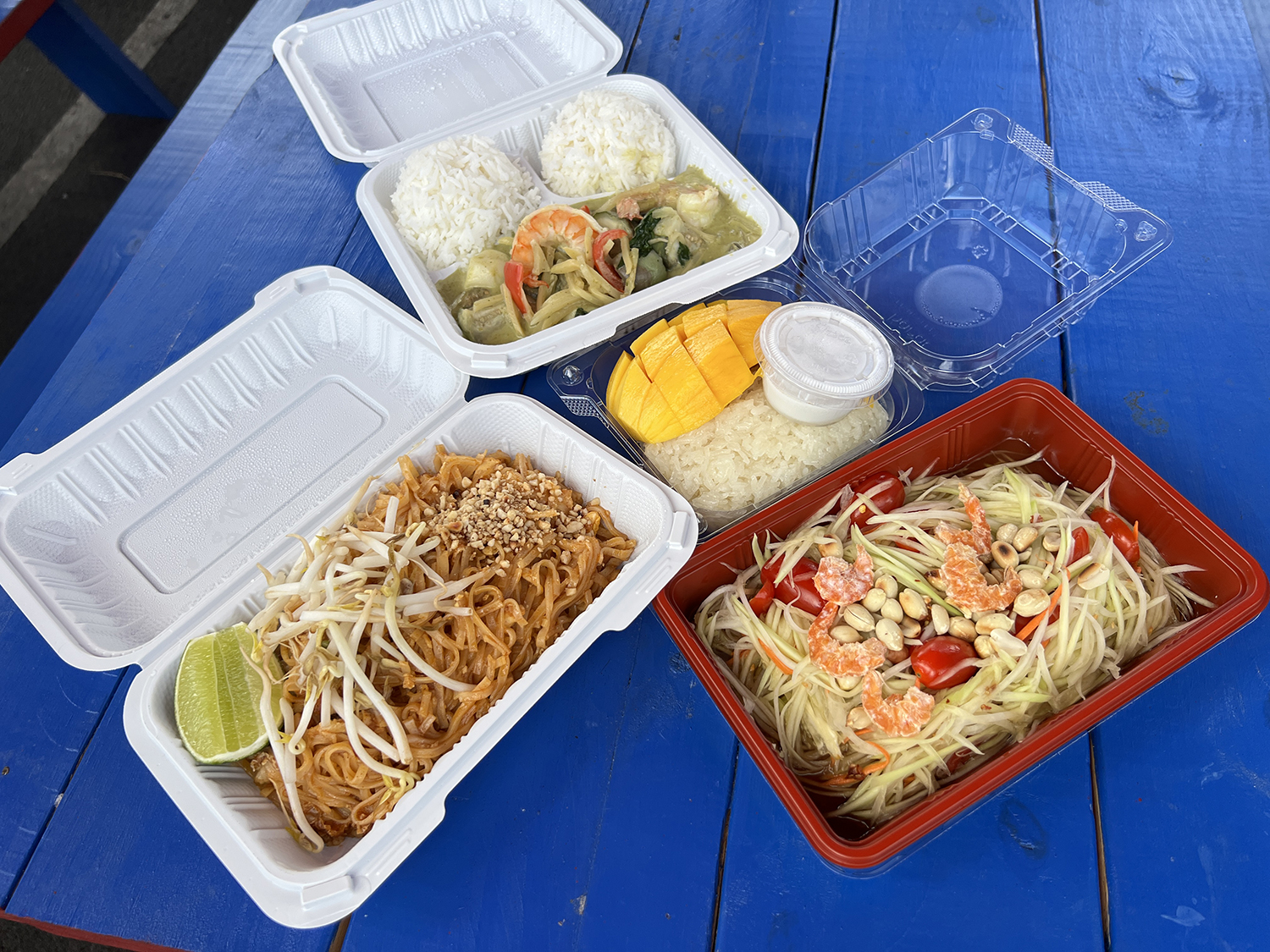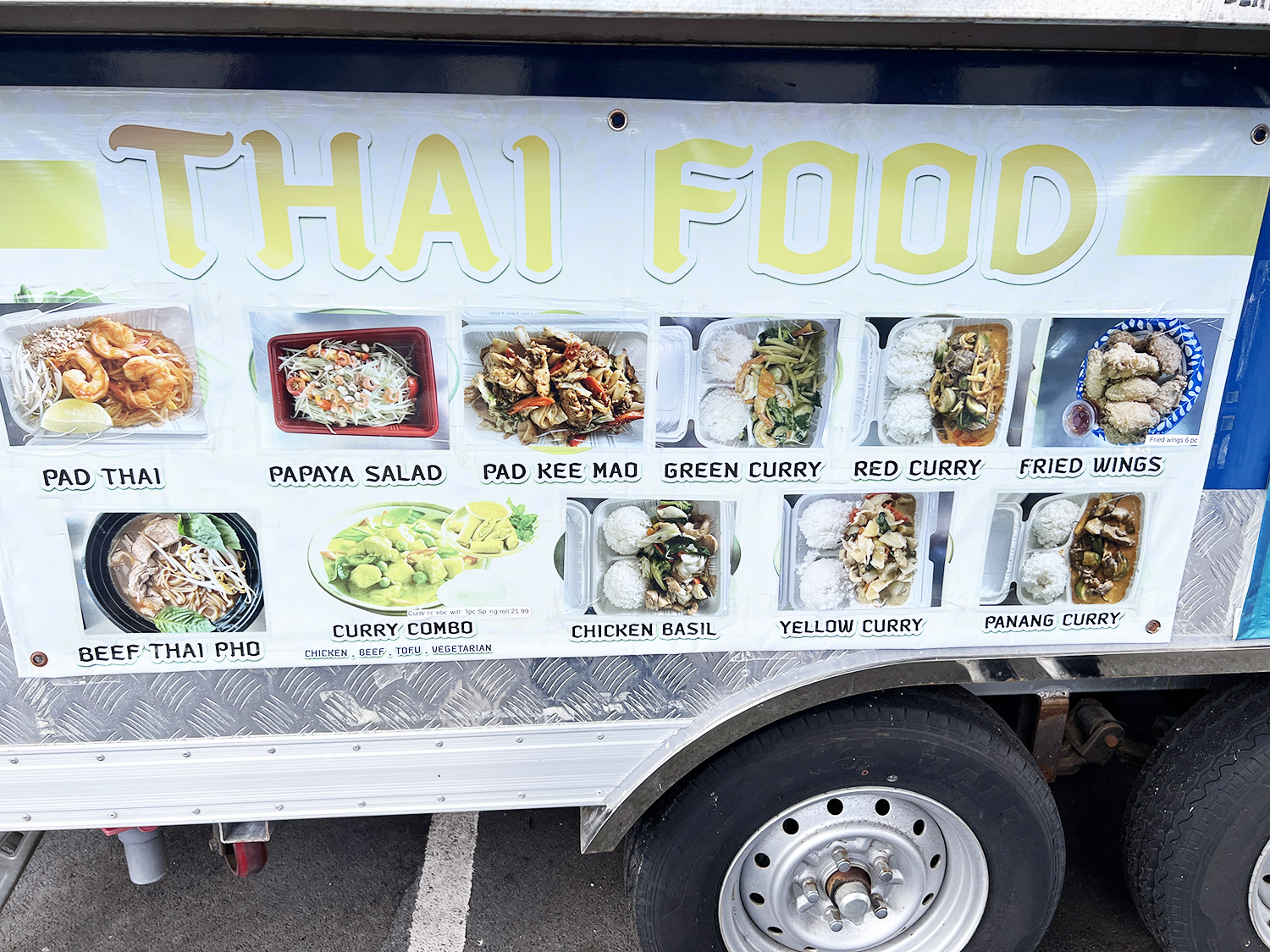 スパイシーな香りが漂う、ローカルにも人気のタイ料理トラック。パッタイやグリーンカレーなど、出来たての味を気軽に楽しめます。