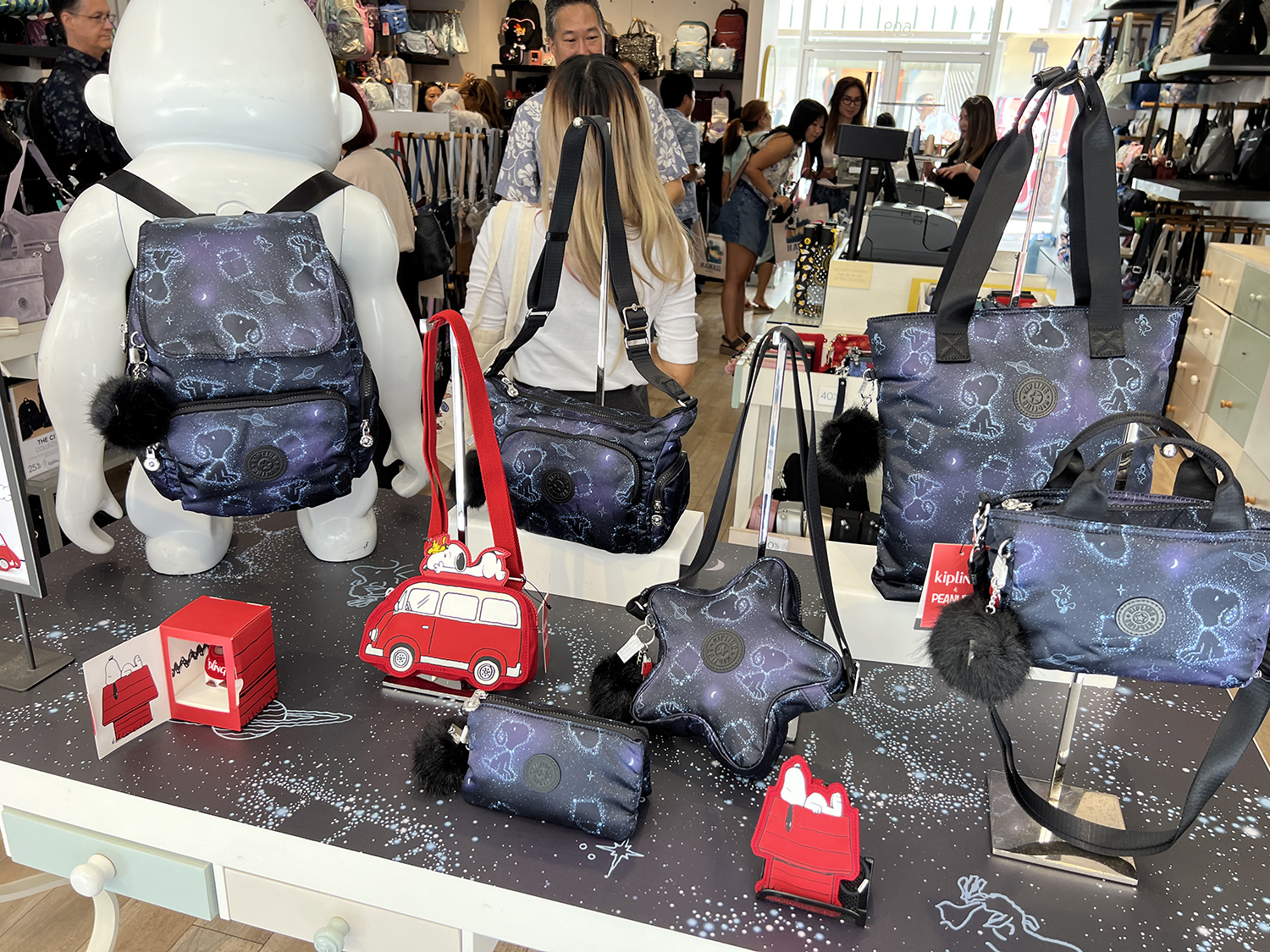 軽くて丈夫なナイロン素材に、思わず目を引くカラーバリエーション。店内には定番のバックパックやトートに加えて、限定コラボ商品や、ハワイ限定デザインも並びます。