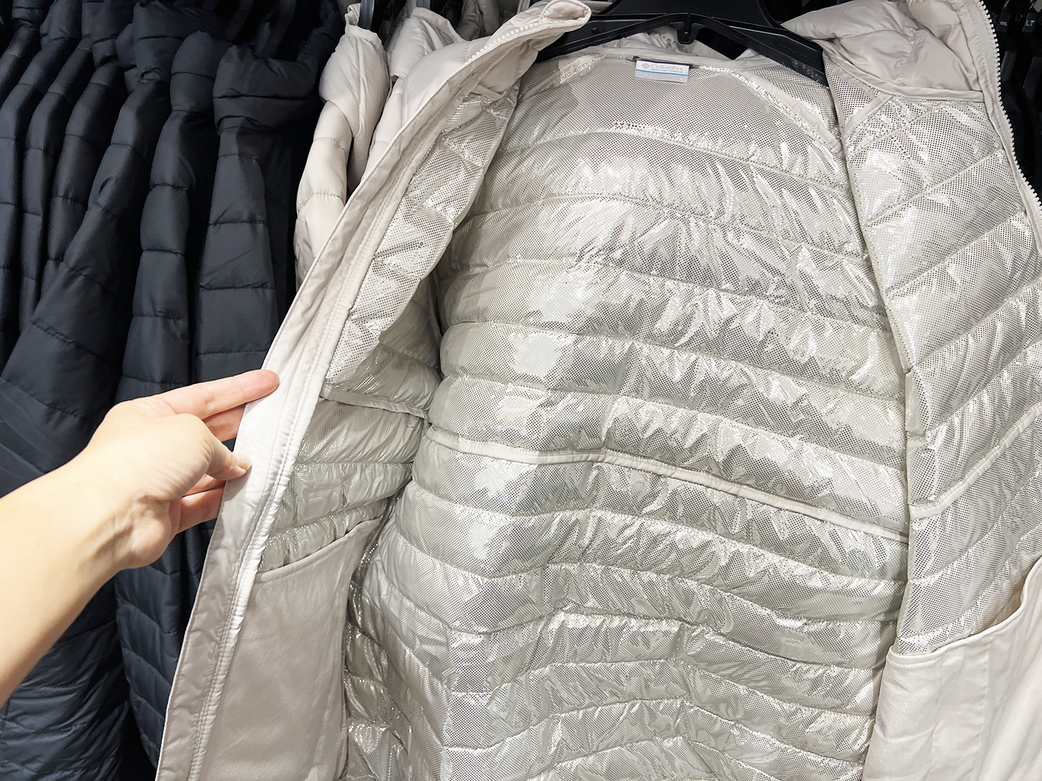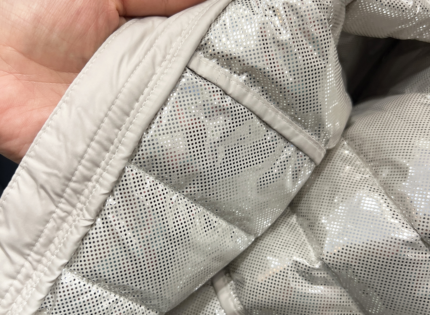内側に光を反射するシルバーのドット加工が施された保温素材。裏地が体の熱を効率的に反射して、羽織った瞬間からふわっと暖かい。