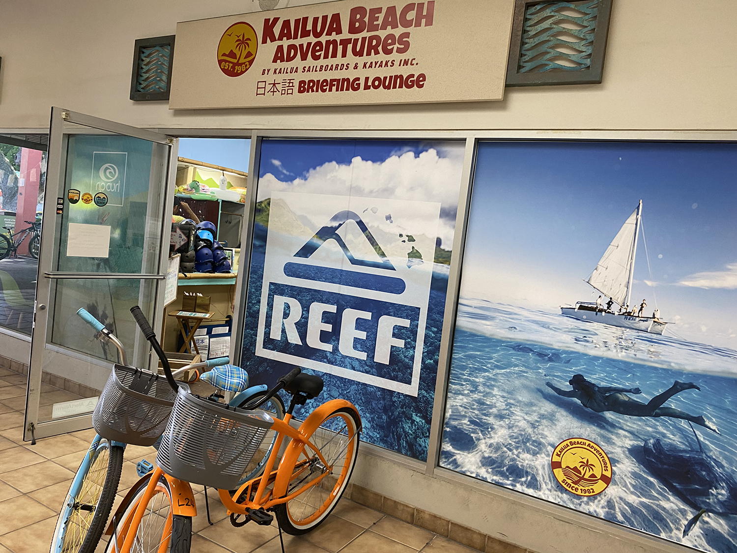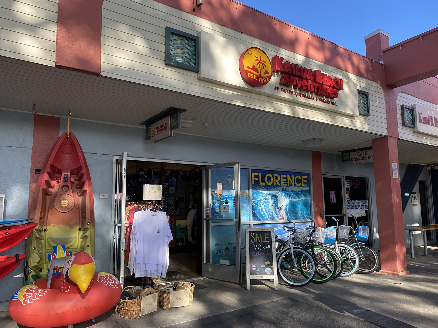 ワイキキから送迎バスで約30分。朝9時頃、カイルアビーチのすぐそばにあるショップに到着。