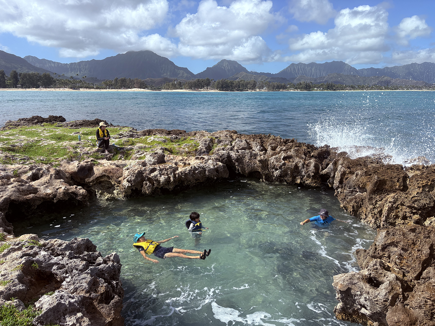 ガイドさんに島に生息する鳥や植物やカイルア周辺の自然についてなどのお話を聞きながら、ゆっくりハイキング。途中には、こんなお風呂のようなプールのような場所が!