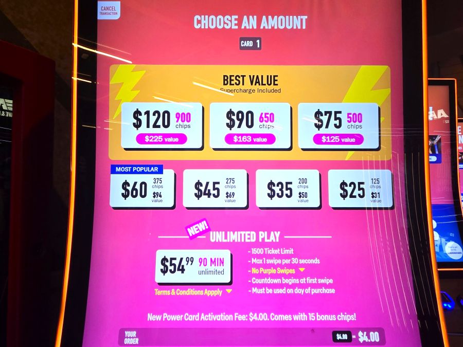 入店したらカード購入機で「パワーカード」を購入しましょう。金額設定のあるプランに加えて90分遊び放題などのプランや、回数制のチャージが選べます。90分遊び放題以外のプランのカードは有効期限なしで、再来店時の残高も使えるのが嬉しいポイント。近々日本語のカード購入機が導入されるそうなので、ますます便利にご利用いただけます!
