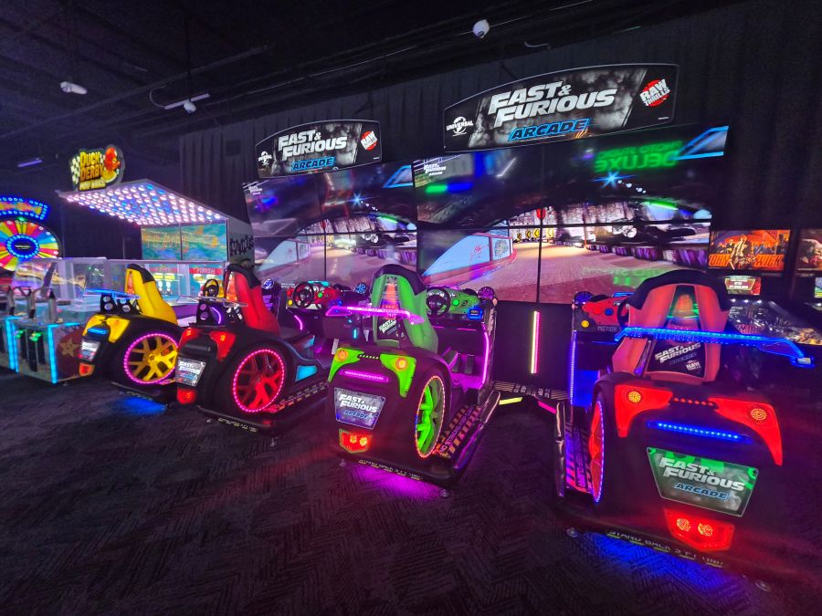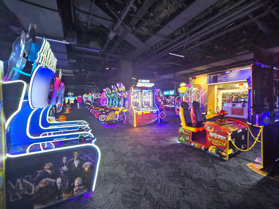 ・大型ゲームセンターには対戦型・体感型ゲーム機がずらり。日本では見かけないスケールの大きなゲームも多く、館内はとても広々としています。歩き疲れたらすぐお隣のレストランのテーブルで休むこともできます。