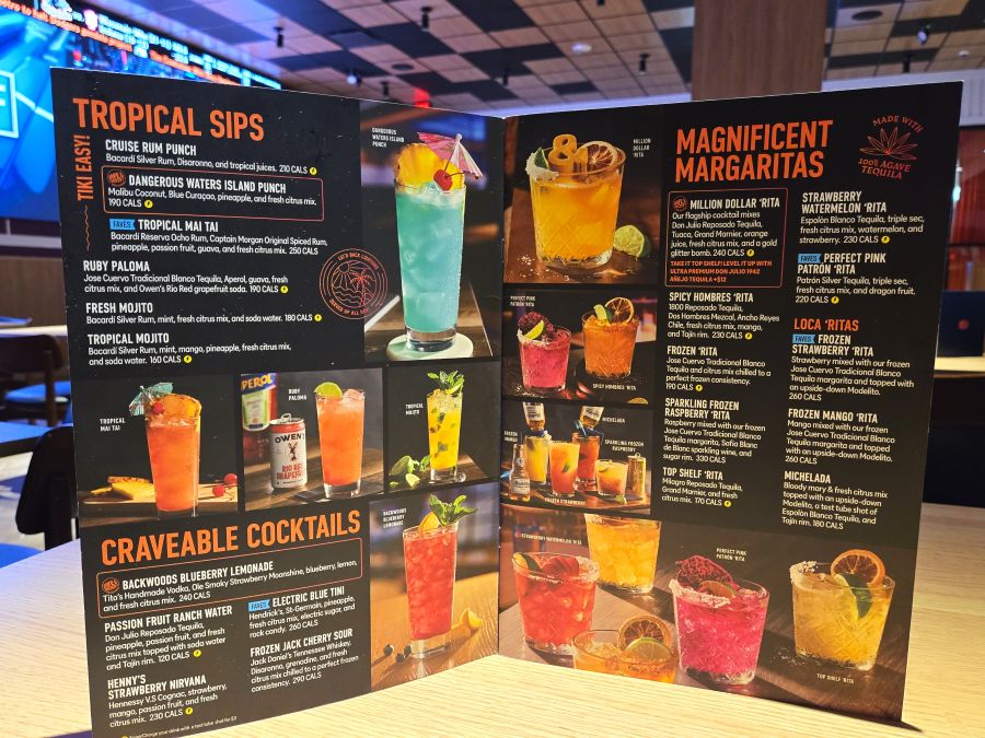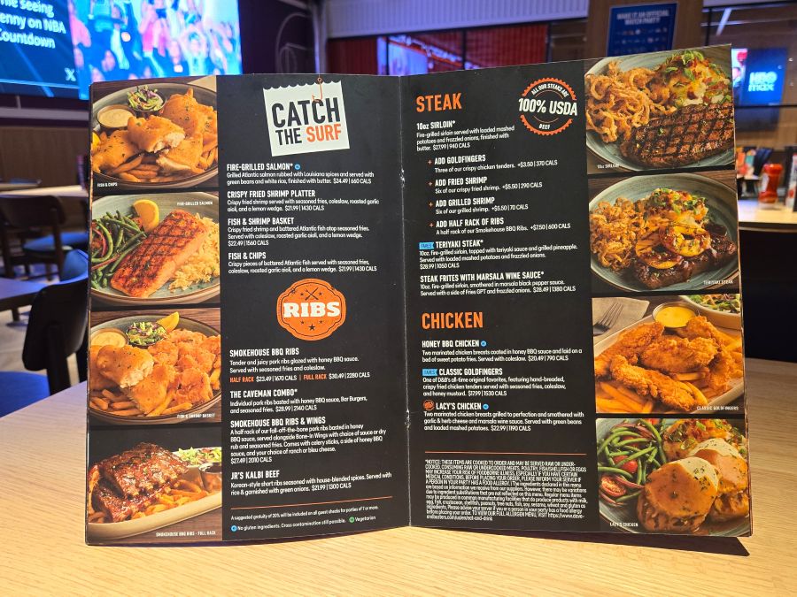 $59.99で90分遊び放題+食事がセットに。メニューはチキンウィング、フィッシュ&チップス、ダブルチーズバーガー、クリスピーチキンサンド、チキンシーザーサラダなど。