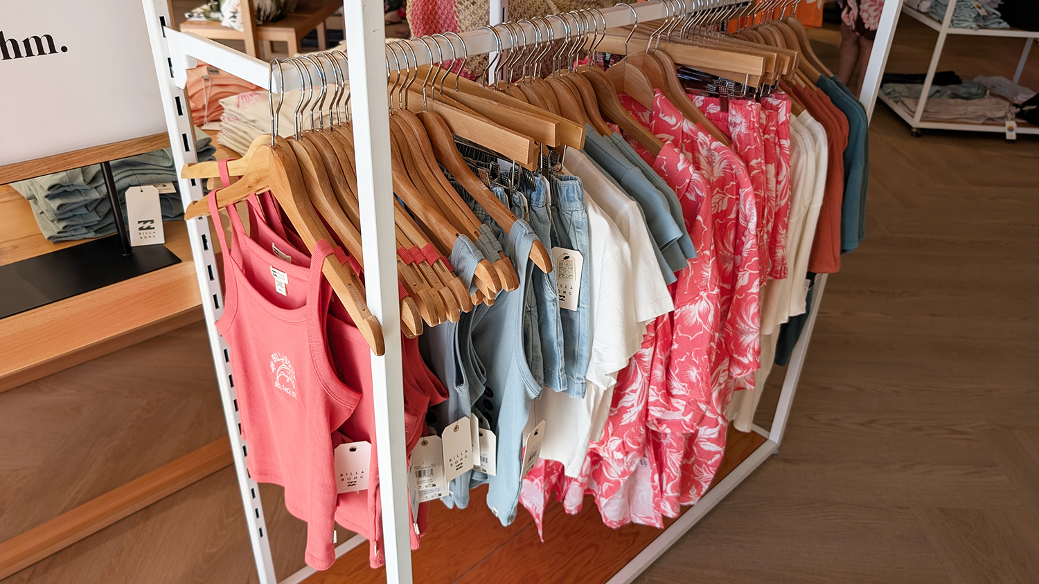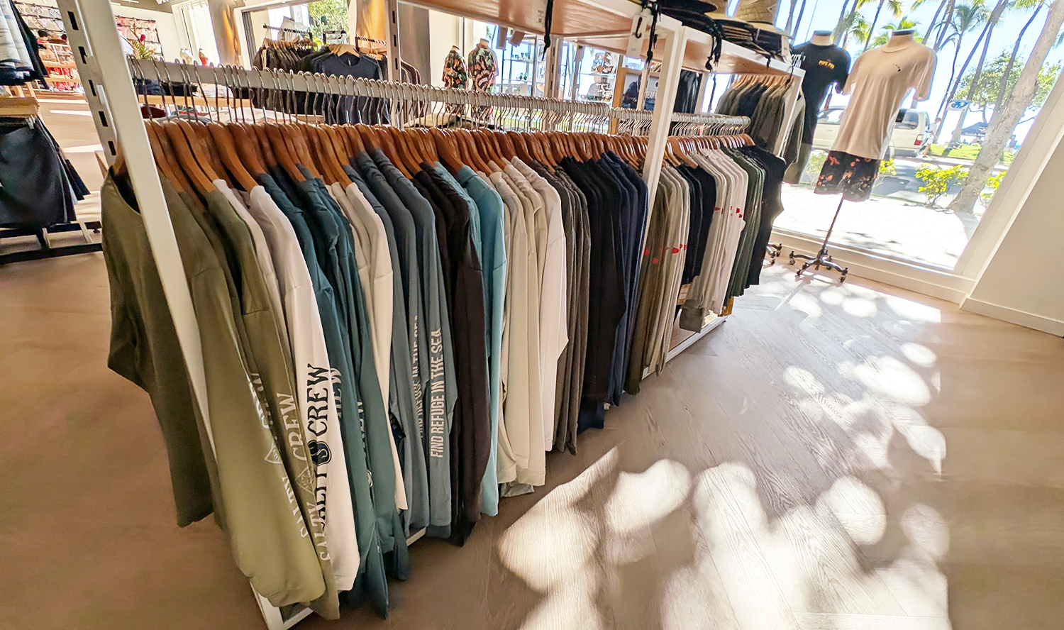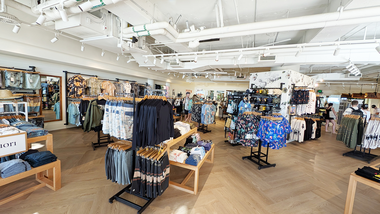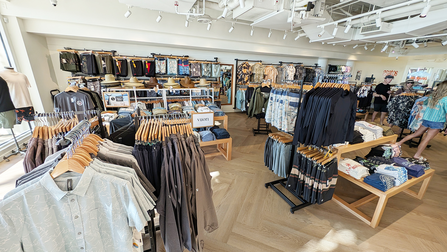レディースエリアには、水着に加え、リゾートワンピースやビーチスタイルに適したアイテムが揃っています。華やかさの中に、ハワイらしい抜け感を取り入れたデザインが多く、サーフカジュアルな要素を楽しみながらも、取り入れやすいラインナップが揃っています。