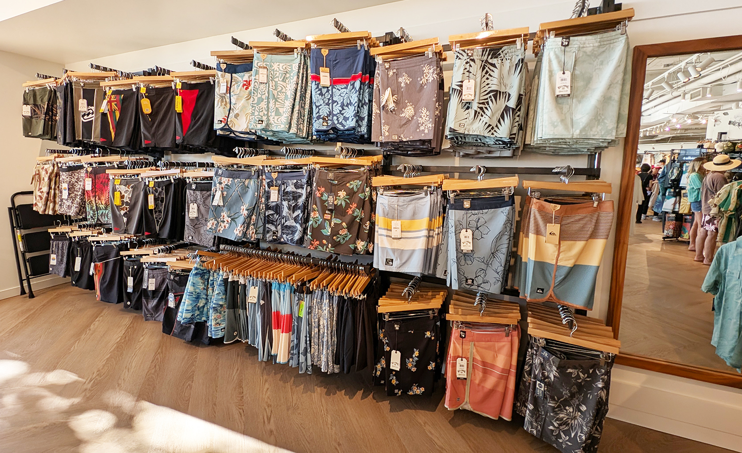 アロハシャツを中心に、ボードショーツやラッシュガード、ビーチサンダルまで幅広く揃い、ビーチシーンから街歩きまで、ハワイ滞在のさまざまな場面に対応できます。