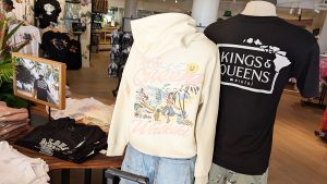 店内中央には、キングス&クイーンズのオリジナルTシャツやスウェットが豊富に並び、デザインやカラーのバリエーションを実際に見比べながら選ぶことができます。