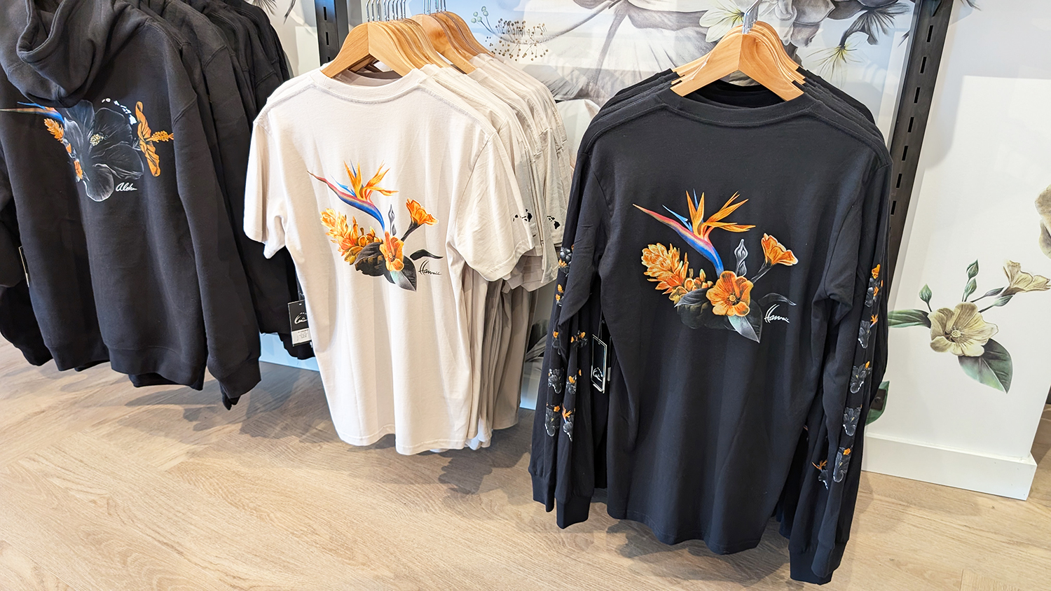 アートの世界観をそのまま落とし込んだTシャツやボードショーツなどは、この店舗でしか手に入らない限定アイテムとして揃っています。