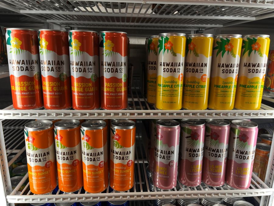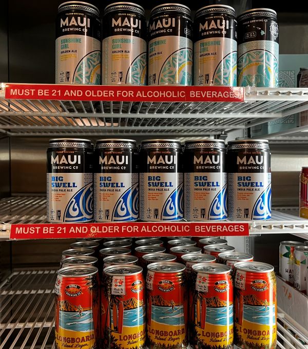ハワイのビールやコーヒー、ソーダ類がずらっ~と。袋に入るサイズのパックのワインも赤と白をご用意!