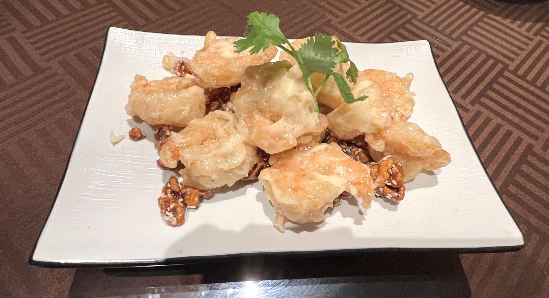 カリっと上げた大き目のエビを、甘めのマヨで和え、キャラメリゼしたクルミをトッピングしたアメリカ中華の人気メニュー。