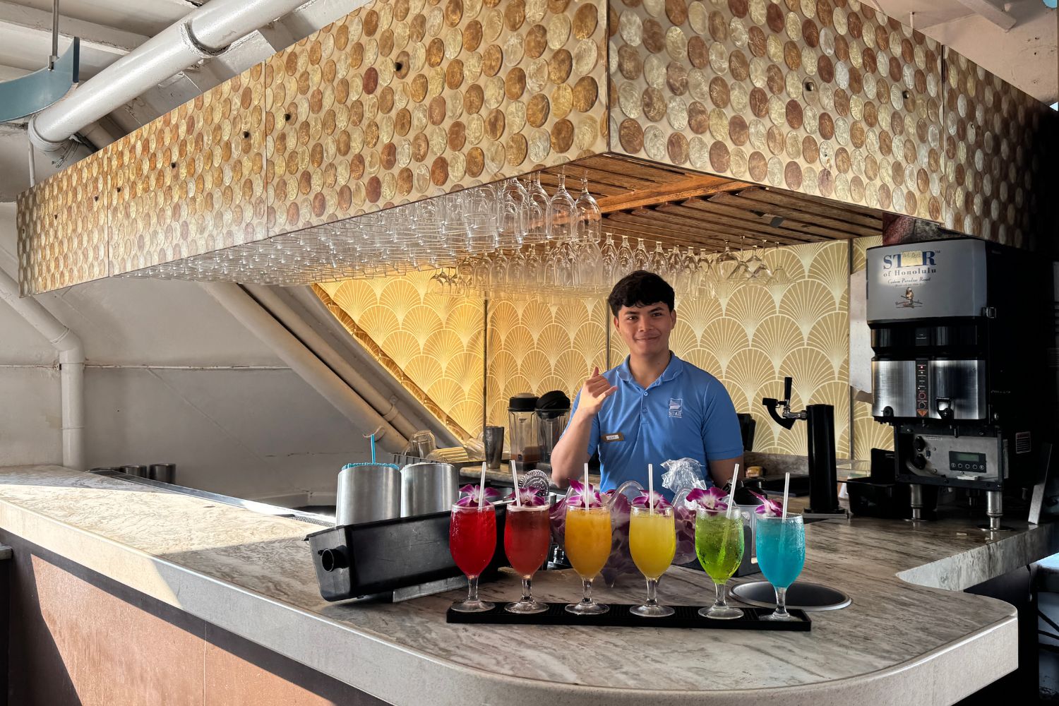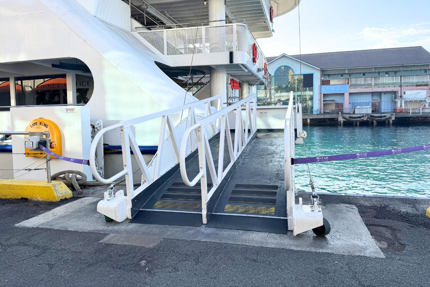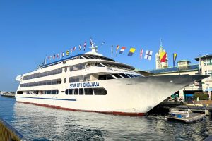 これから乗船する「スター・オブ・ホノルル号」は全長約70m、定員約1,500名の大型船。バリアフリー対応で、車椅子の方も利用できるスロープやエレベーターが完備されています。
