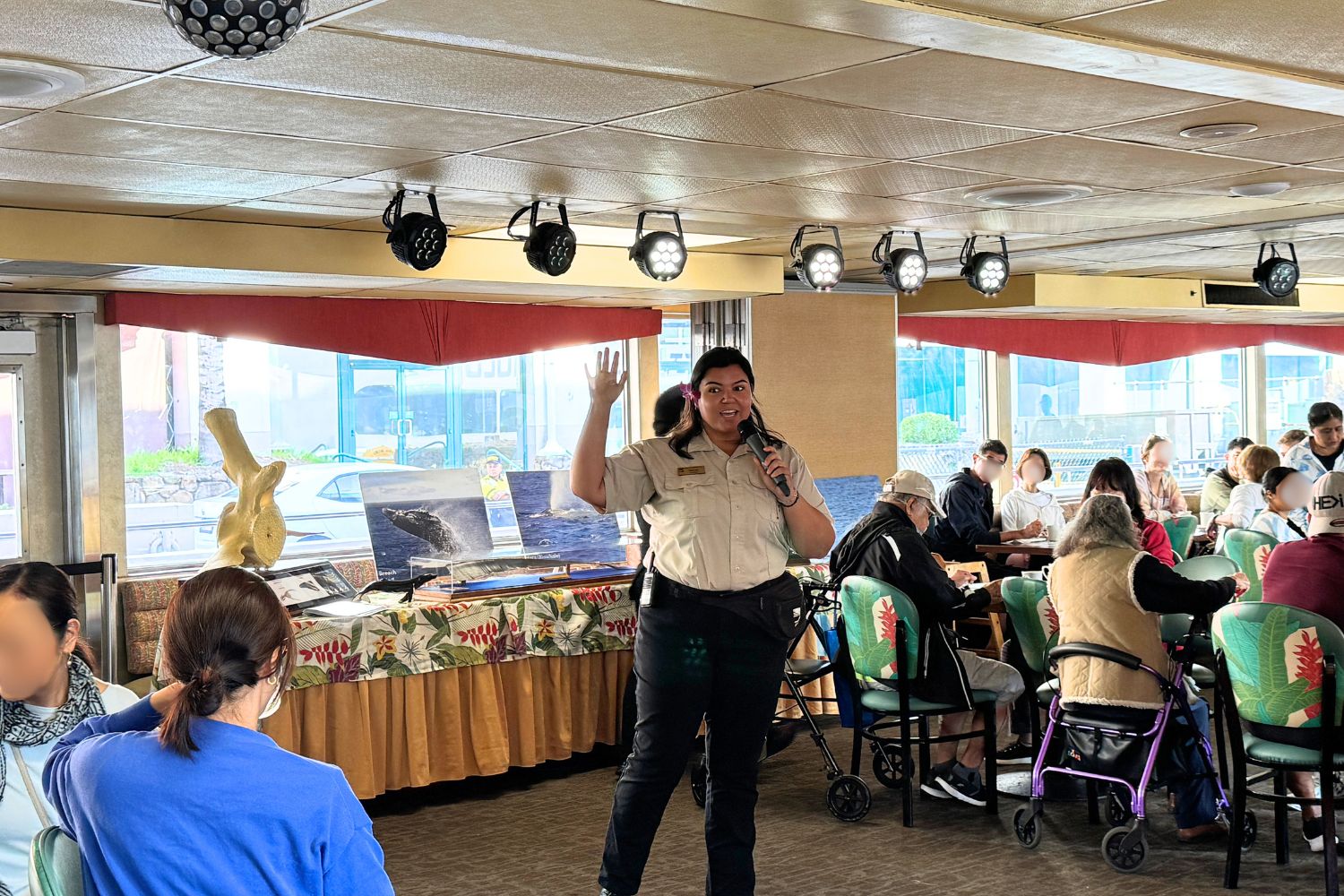 船内にはクジラに関する資料や写真の展示もあり、乗船中はクジラについての豆知識アナウンスも流れます。