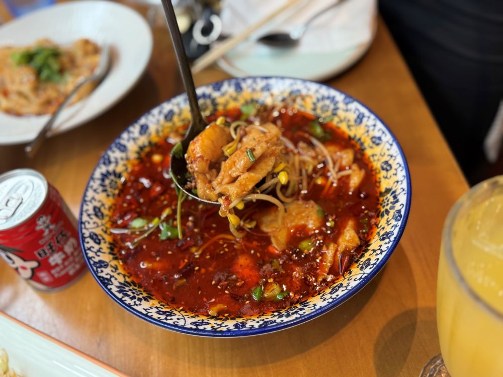 辛みのあるスープの中に、ふわふわのお魚ともやしがたっぷり。四川料理らしい刺激的な辛さで、辛い物好きにはたまらない一皿です!