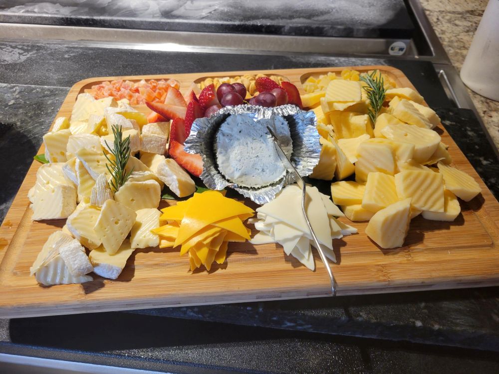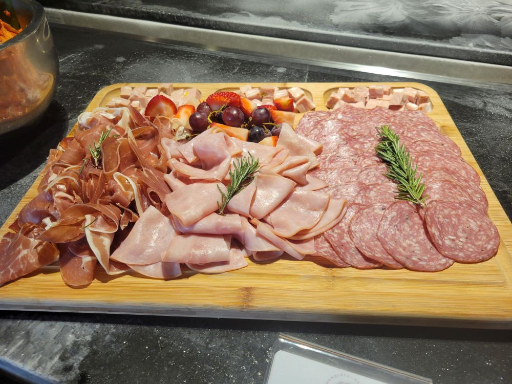 隣のラインにはチーズとフルーツに、生ハムやサラミなど。お酒のおつまみにも良いし、甘いものが苦手な人には、食後のデザート代わりにも。