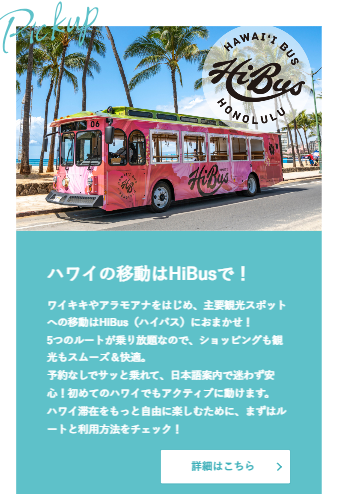 ワイキキ・アラモアナ・ダウンタウン、カハラ、ダイヤモンドヘッドなど人気の観光エリアを結ぶ、観光に便利な移動手段、HiBus。