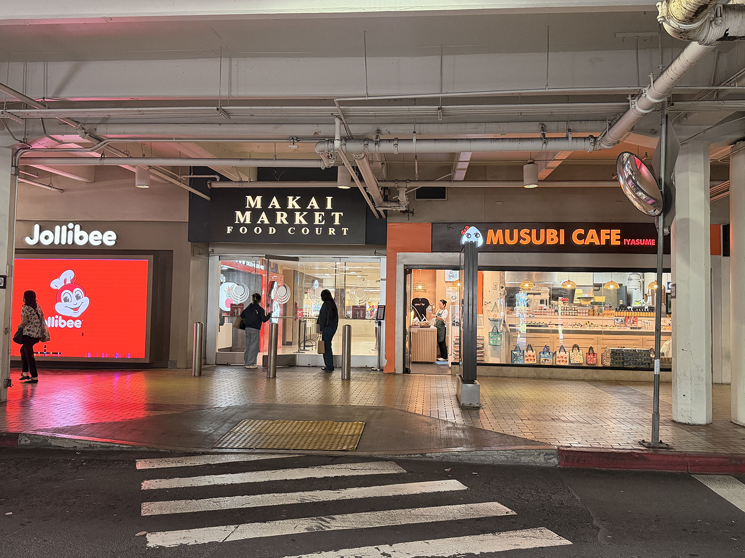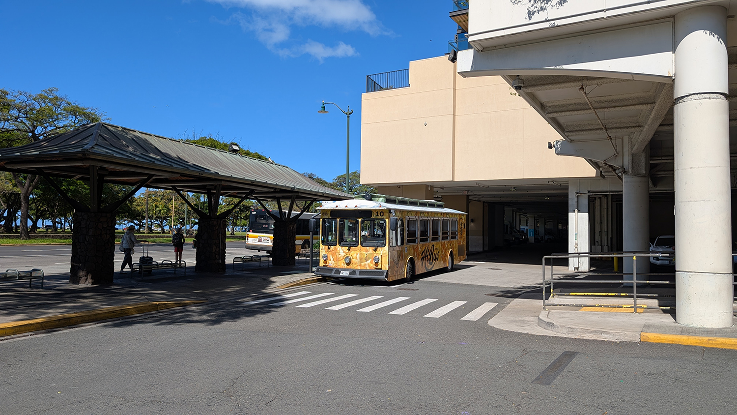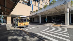 マカイマーケットフードコートを出たあと、ムスビカフェいやすめさんの前にある横断歩道を渡ると、あとはHiBus乗り場まで直進でとても分かりやすいです!周辺にはトロリー各社の停留所も集まっており、初めての方でもひと目で分かりやすいロケーションとなっています。