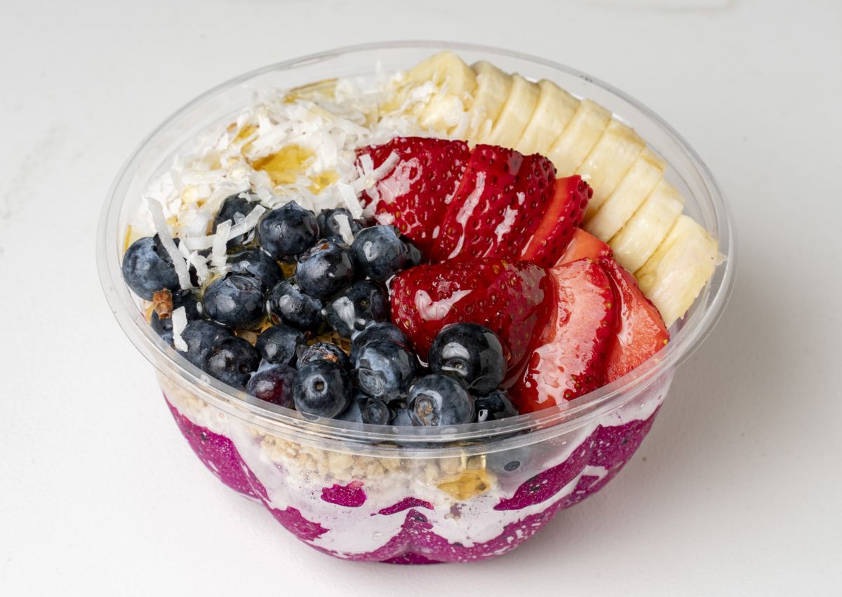 新鮮なフルーツたっぷりの「アマゾンボウル」は、アサイとピタヤから選択可能。また、カカオニブ、チアシード、スピルリナ、マカなどのトッピングをひとつ$1で追加できるので、自分好みのフルーツボウルを作ってみて。
