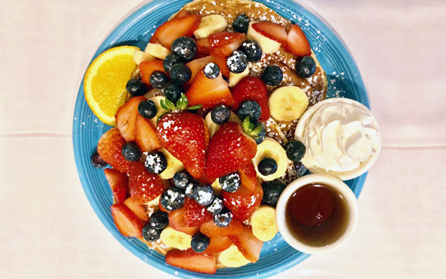 お店のシグネチャーともいえる「パンケーキ」!フルーツがたっぷり乗っていておいしそう~♪♪フルーツとオリジナルのパンケーキはシンプルで甘いもの苦手な方にも大丈夫。