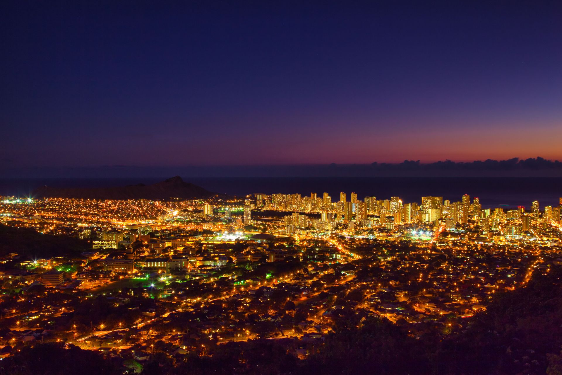ハワイ州ではネオンサインが禁止されているため、街の灯りはオレンジ色を基調としたやさしい光に統一されており、眼下に広がる景色はまるで宝石箱のような美しさです。