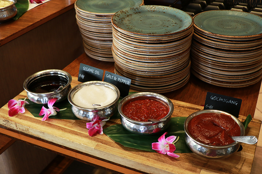 牛肉や豚肉のほか、野菜もあります。ソースは、ごま油や塩胡椒、また韓国のコチュジャンまでさまざま。お好きな味付けでお召し上がりください♪