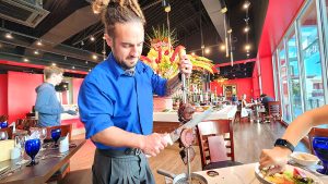 お肉を食べる用意が出来たら、テーブルの上の丸いやつを「緑」にしてください!これが用意が出来たという意味で、熱々の長い串に刺したブロック肉を焼き上げたブラジルの伝統料理「シュラスコ」をサーバーさんが入れ替わり立ち代わり持ってきてくれます。「赤」はストップの意味となります。