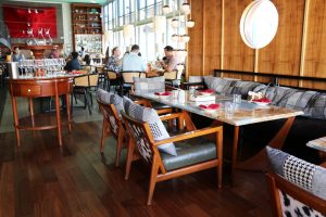 床から天井までの大きな窓からは太陽光がたっぷり入り、窓際にはゆったりとしたレザーカウチのボックス席が並びます。