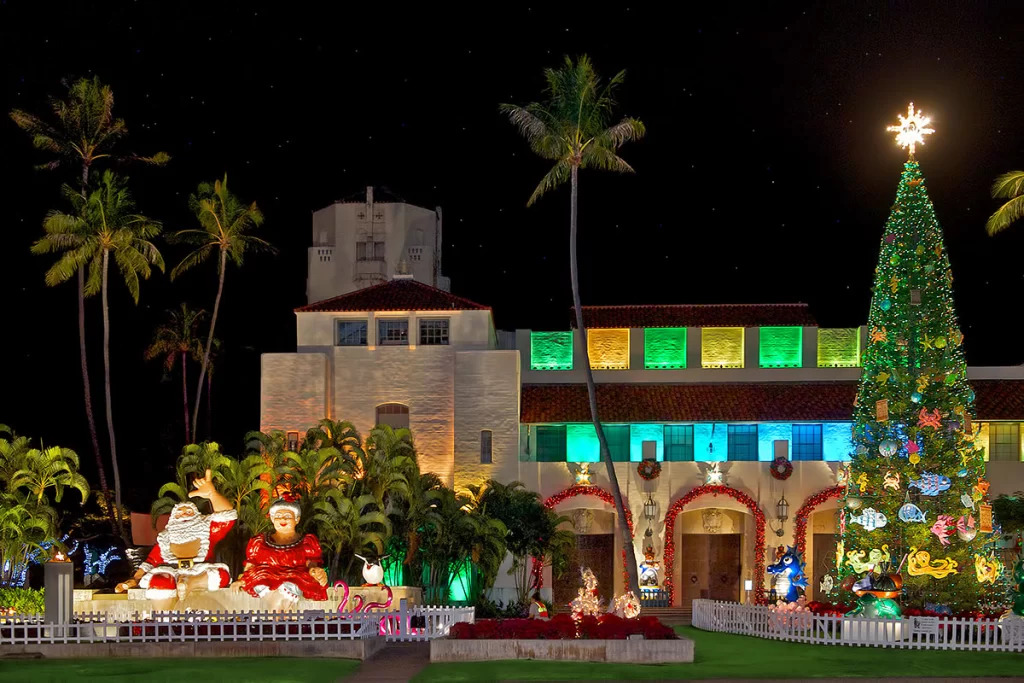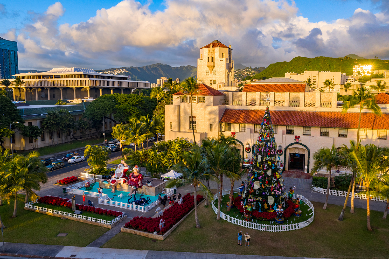市庁舎前のホノルルハレ周辺では、一年で最も街が輝くイベント 「ホノルル・シティ・ライツ」 が開催され、巨大ツリーやイルミネーション、温かな笑顔あふれるローカルのホリデームードに包まれます。