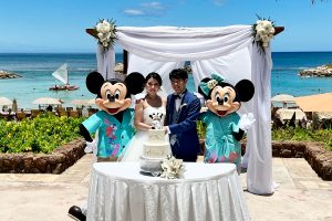 ピカピカに晴れた夏の日にコオリナのアウラニホテルで開かれたウェディングにお邪魔してきました。青い海、青い空、ハワイアンブルーの景色をバックに、新婦さまの白いドレスも新郎さまの青いタキシードも見事に映え、素敵な式になりました。ミッキーとミニーもお二人のアツアツぶりに終始当てられっぱなし♪